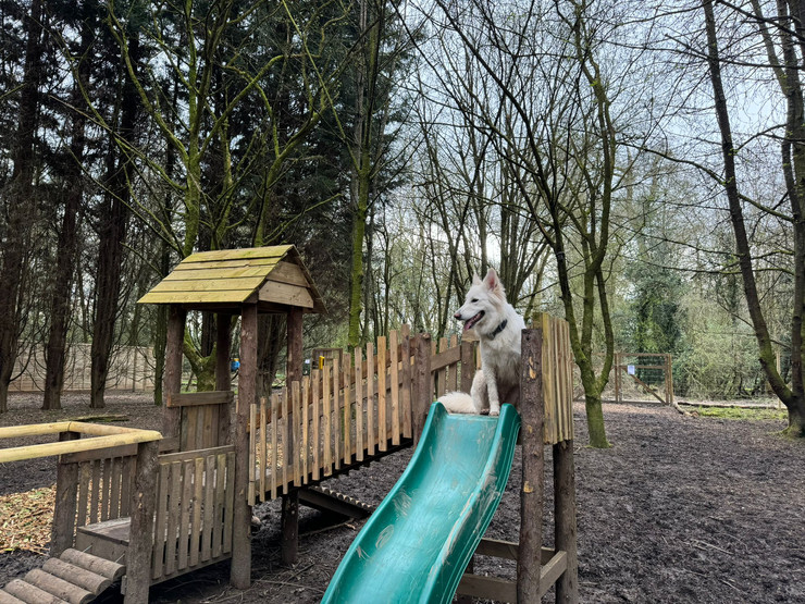 Designed for reactive dogs or for complete privacy, our 'invisible' spaces allow you to drive directly inside your play area to park, has a private doggie shower & cafe 'room service'.
